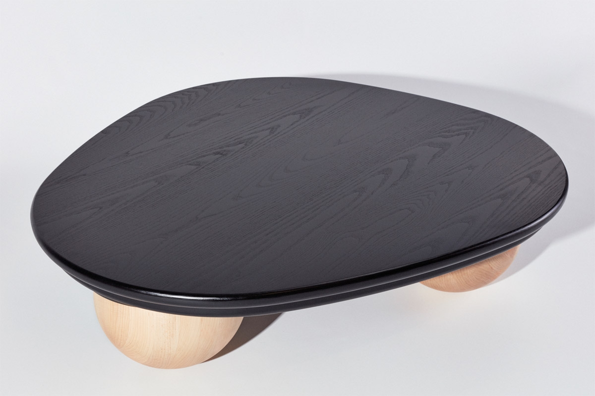 The table is made with a solid American Ash top, while the spherical legs are made in Maple. Fine tuning was needed to create the exact weight needed to roll smoothly across the floor. As well as timber, Flanagan works with a range of materials and processes, like bronze and aluminium sand casting, and also turns his hand to the creation of particular colours and wood stains.
